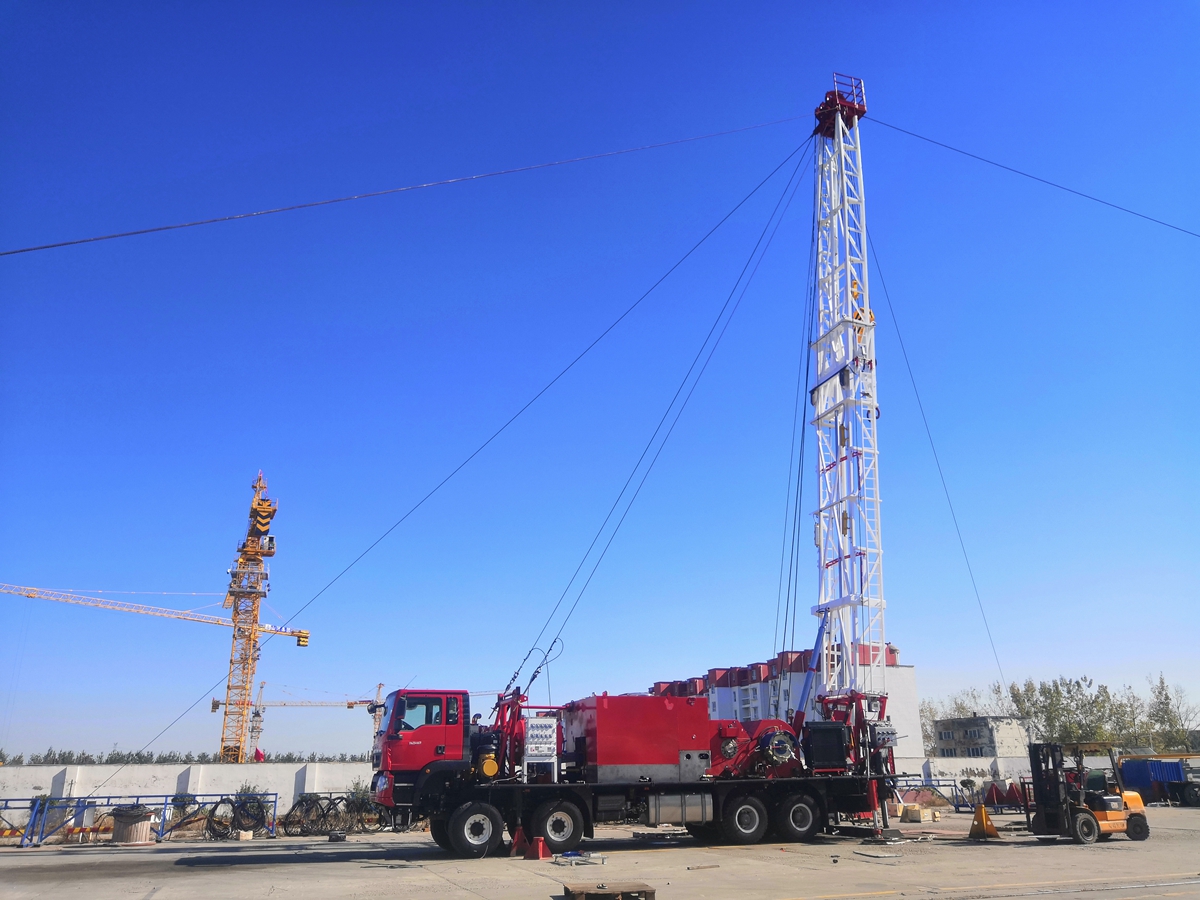 本產品是在常規(guī)車載修井機基礎上,將防風繃繩固定于大跨度的井架基礎和鉆臺底撬上。與常規(guī)車載修井機相比,作業(yè)能力完全相同,但占地面積小。特別適用于面積不夠或者無法固定防風繃繩,同時作業(yè)載荷要求又較大的井場。自繩繩修井機最大鉤載可達1800kN。