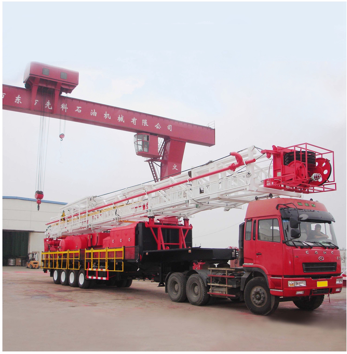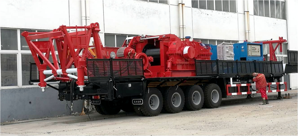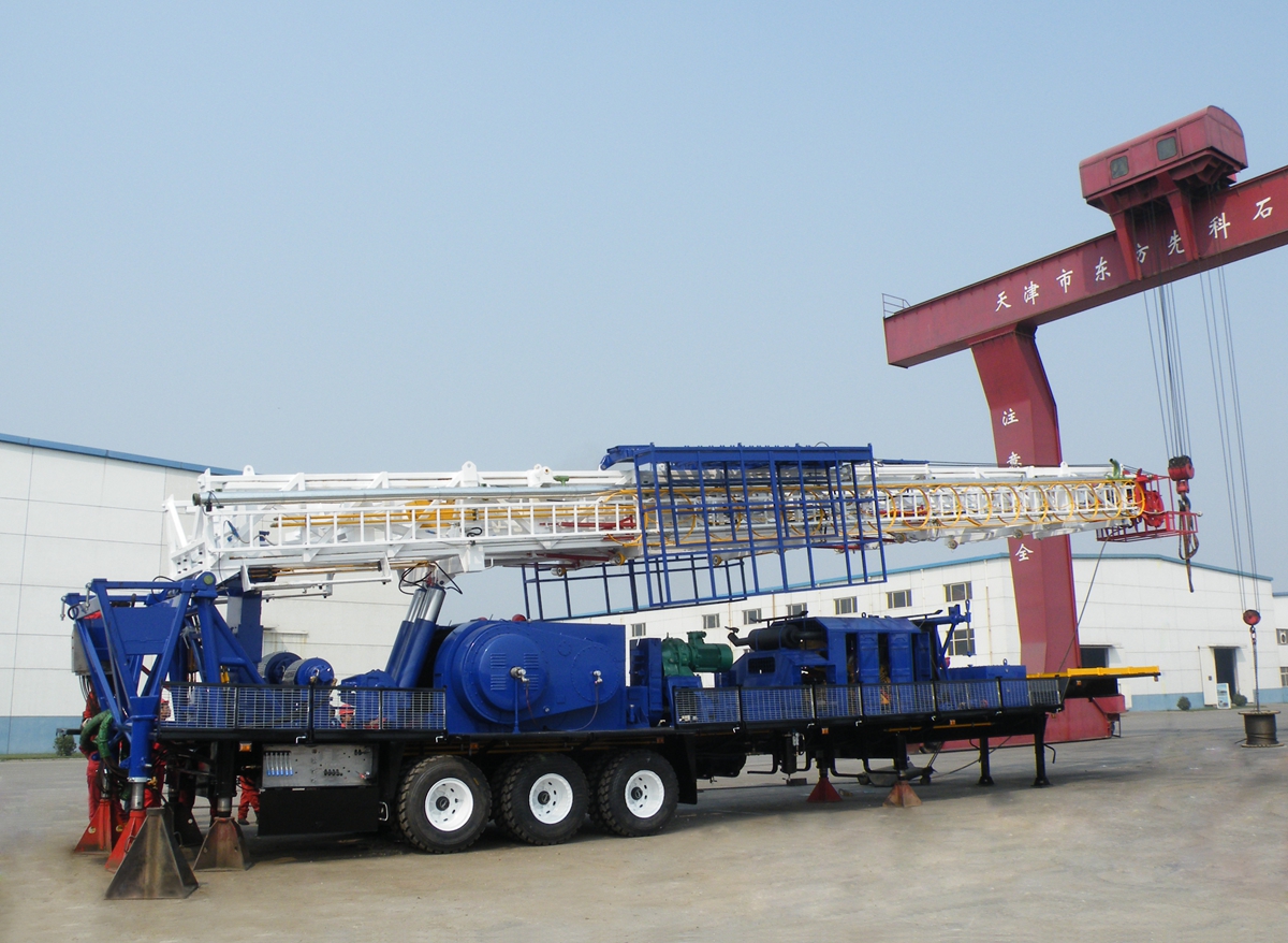 拖裝鉆機(jī)的動(dòng)力、絞車(chē)、井架、游車(chē)系統(tǒng)及傳動(dòng)機(jī)構(gòu)全部裝載于半掛底盤(pán)上,移運(yùn)時(shí)用牽引車(chē)拖掛移運(yùn)至現(xiàn)場(chǎng),該類(lèi)產(chǎn)品對(duì)于提高鉆井作業(yè)搬遷效率具有很大的優(yōu)勢(shì),而且節(jié)約移運(yùn)資源,適合油區(qū)道路條件較好、井場(chǎng)相對(duì)開(kāi)闊的油田。我公司設(shè)計(jì)制造的1500米、2000米、3000米和4000米鉆深的柴油機(jī)驅(qū)動(dòng)半掛鉆機(jī)車(chē),其最大靜載荷從1350~2250kN,具有作業(yè)負(fù)荷大、性能可靠、越野能力強(qiáng)、搬遷方便、費(fèi)用低等特點(diǎn),適應(yīng)于中淺井鉆井作業(yè)。